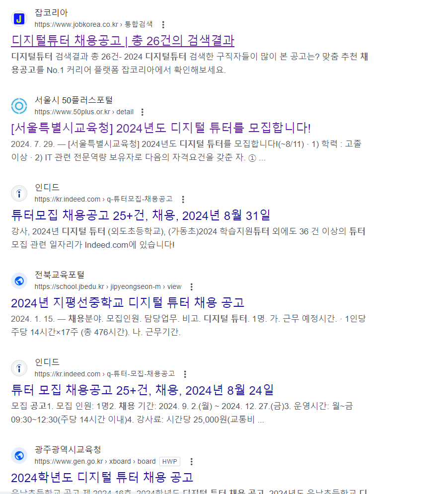 각 학교나 교육기관에서 이미 디지털 튜터를 채용하고 있습니다. 위에 작성한 글에서도 알수 있듯이 교육부에서 각 권역별로 총 800명의 무료교육을 진행하는 이유를 보면 필요한 일자리에 비해 디지털 튜터의 수요가 적은 것을 알 수 있습니다. 이런 상황으로 봐서 수요는 앞으로 더욱 늘어날 것이기 때문에 전망은 좋아 보입니다. 아래 검색결과를 보면 수요가 있음을 알 수 있습니다.