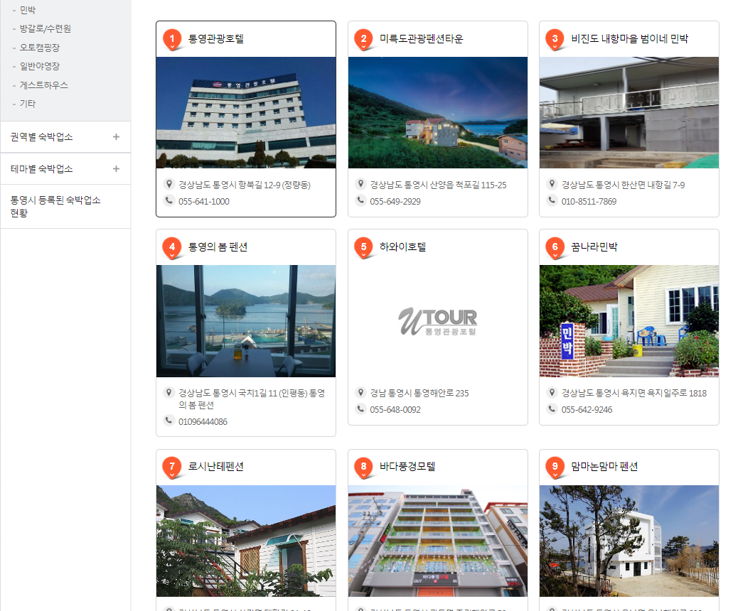 축제 기간에는 아무래도 바가지요금이 걱정인데요, 통영시청에 직접 등록되어 운영하는 숙박업소를 검색해 보세요. 그럼 안심이죠. 다른 곳들과 가격 비교해 보시고 선택하세요. 아래 버튼을 클릭하시면 숙박업소 검색으로 이동합니다.