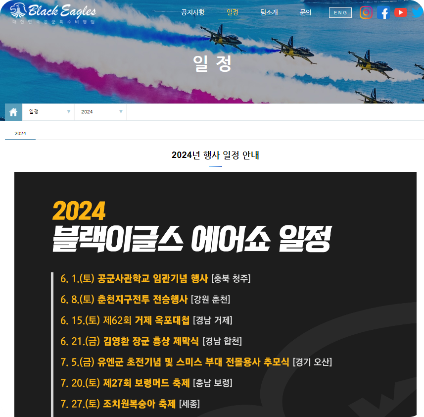 - 국내 에어쇼 일정: 블랙이글스는 대한민국 내에서 열리는 여러 에어쇼와 군사 행사에 참여합니다. 이러한 행사들은 주로 봄과 가을에 집중되어 있으며, 전국 각지에서 개최됩니다.