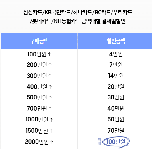 - 7개 카드사 결제 금액대별 최대 100만 원 할인(카드사별 예산소진 시 조기혜택 종료)