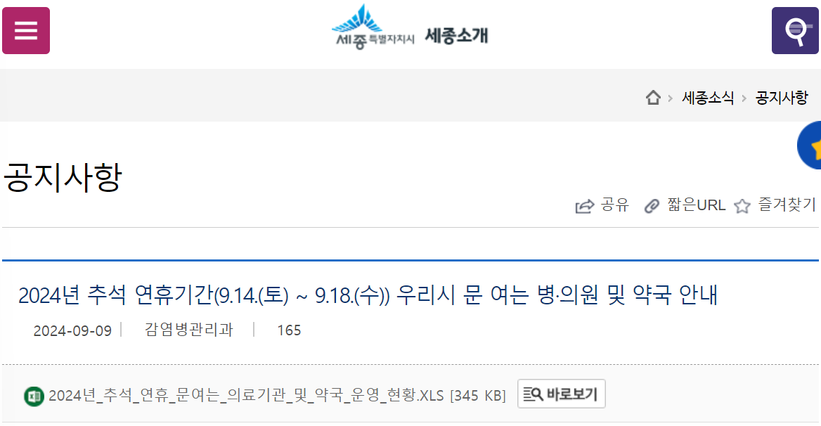 세종시에서는 공지사항에 아래와 그림과 같이 안내를 공지했는데 다른 시도는 어떻게 운영하는지 잘 모르겠으나 많은 시도가 공지하고 있는 거 같습니다. 추석연휴기간 세종시에서 문 여는 병원 및 약국은 아래 엑셀파일을 다운로드하시거나 e-gen앱으로 검색하시면 됩니다.