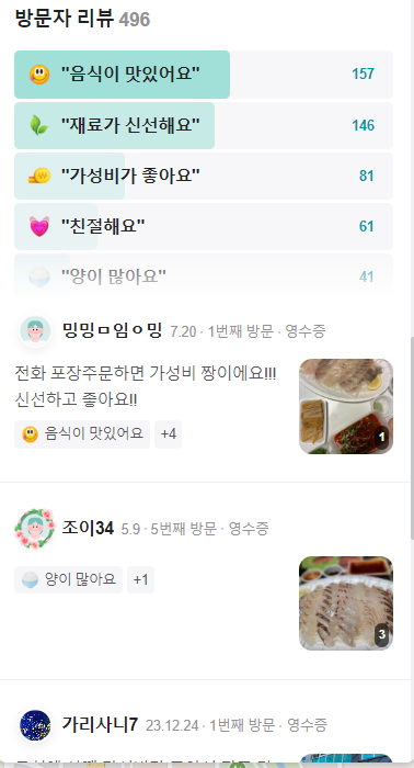 우리 집 근처에 여러 횟집이 있지만 배달한정 당연 1위를 줍니다. 위에서 말씀드릴 내용 외에 빠진 것이 있을 수 있지만 한번 시켜드시면 후회하시지는 않을 거라고 생각해요. 이 글을 작성하는 대가로 이 업체로부터 깻잎 한 장 받은 것이 없고 오로지 제의 개인적인 생각임을 밝힙니다. 다른 리뷰 한번 보시고 결정하세요. 아래 버튼을 누르면 리뷰로 이동합니다.