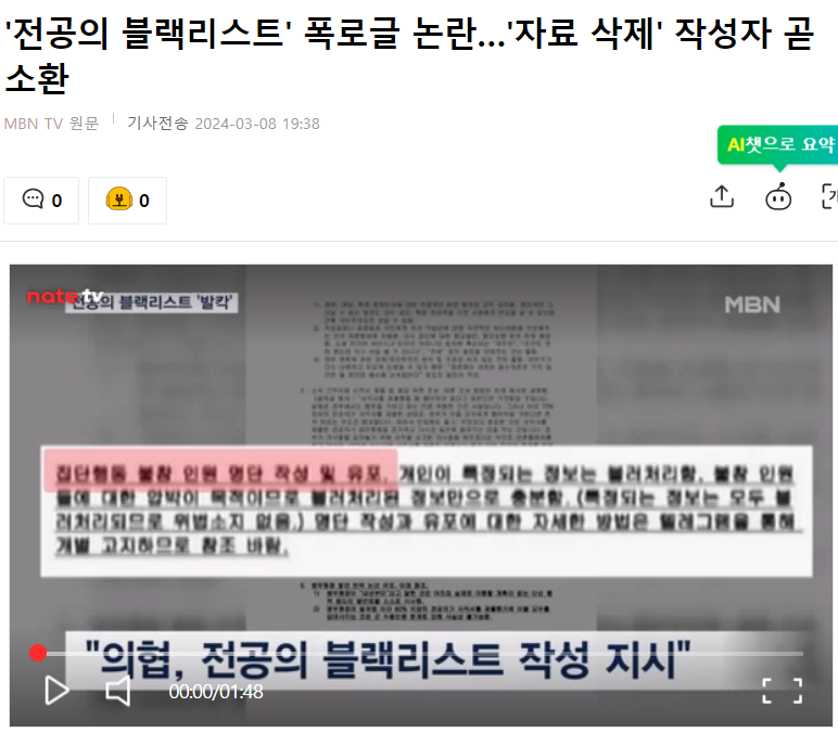 - 전공의 집단행동에 동참하지 않은 의사들의 정보가 담긴 글이 의대생 의사커뮤니티에 게시되었습니다.