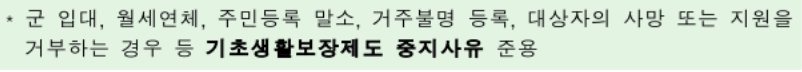 - 군 입대나 90일 초과하여 외국 체류, 부모 합가, 타주소지 전출 후 변경신청을 하지 않는 경우 월세지급이 중지된다.