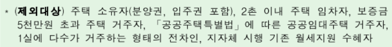 - 중복제외 : 주택 소유자 및 공공임대주택 입주 등을 통해 주거비 경감 혜택을 이미 받은 경우 등은 지원대상에서 제외