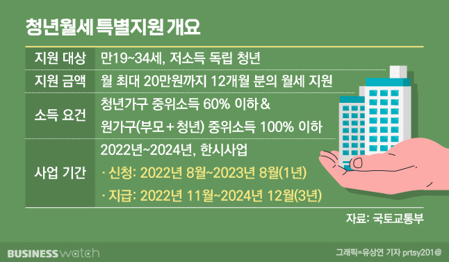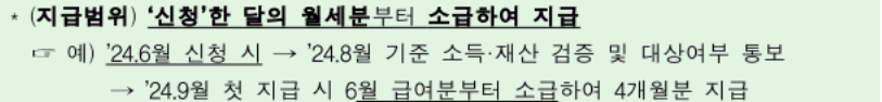 - 신청시기 : 신청은 24년 2월 26일부터 1년간 수시로 가능하며 지자체에서 2월부터 소득, 재산 요건 검증을 거친 후 3월부터 월세를 지급할 예정이다. 지원금은 신청한 달로 소급적용하니 서둘러서 신청해야 한다.