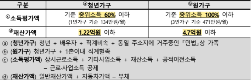 - 청년가구 소득 : 중위소득 60% 이하. 자산 1.22억 이하(1인가구 기준 134만 원)