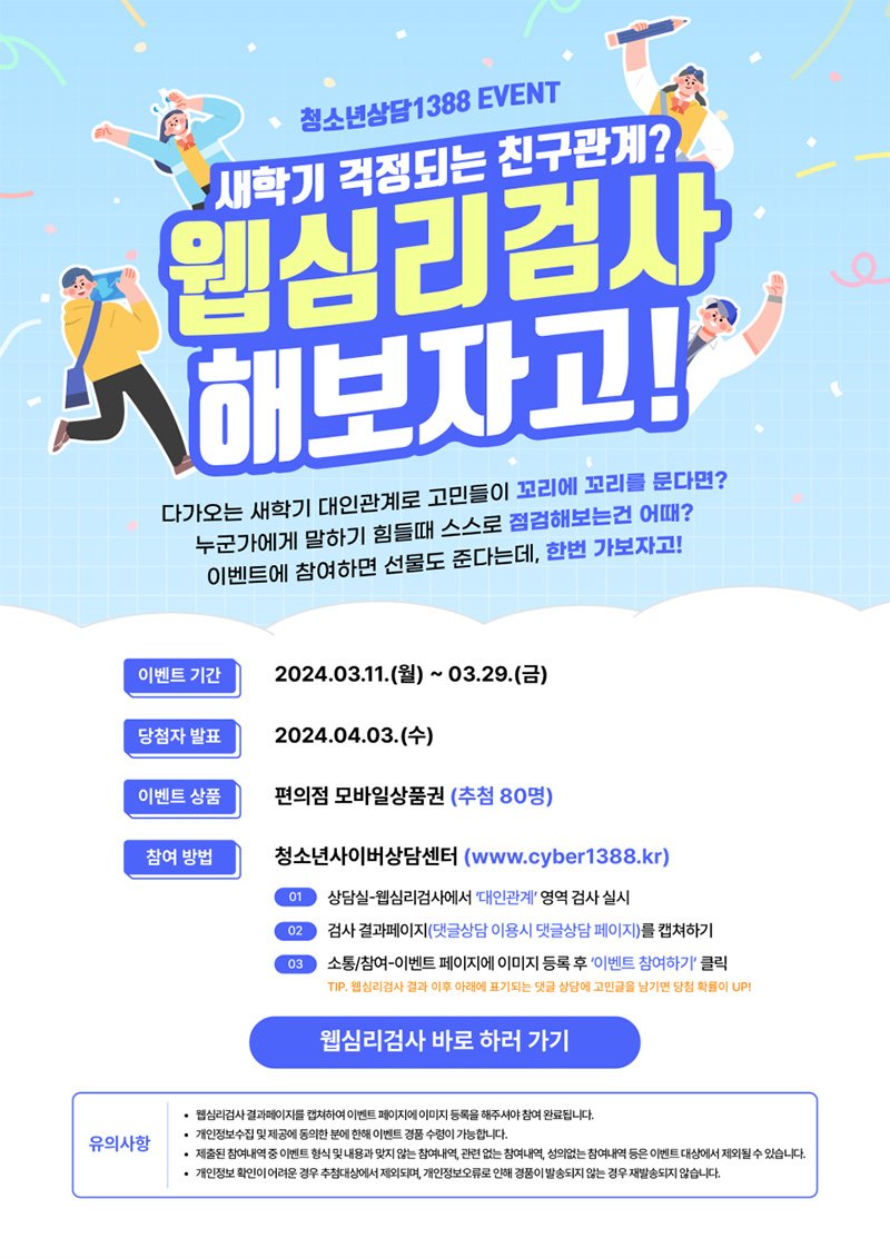 3월 11일부터 29일까지 온라인 행사를 진행하고 있어 웹심리검사 결과 확인 후 댓글 상담에 고민 글을 등록하고 웹심리검사 결과페이지 및 댓글 상담 내역을 캡처해 소통, 참여 이벤트 페이지에 이미지를 등록하면 참여자 80명을 추첨해 모바일 기프트 카드를 제공한다.