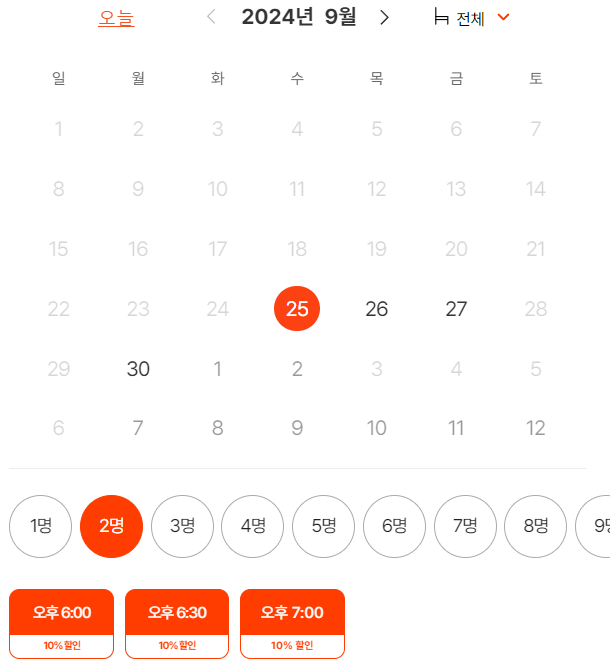 - 예약하기 누릅니다. 원하는 날짜 인원 시간 체크하고 예약하면 됩니다.