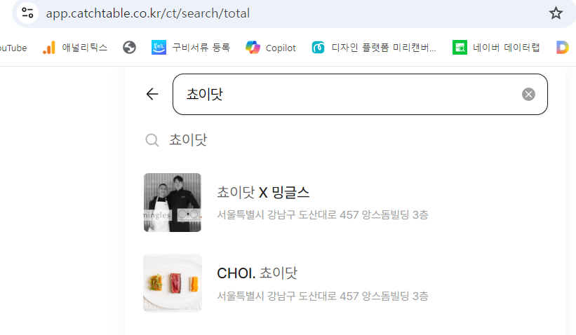 원래 유명한 최현석 셰프이기에 예약이 너무 힘이 드는데요. 평일 점심 정도는 간간이 나오는 거 같고 주말이나 디너는 한참 전에 예약을 미리해야 하는 거 같아요. 예약은 캐치 테이블 앱에서 하시면 됩니다.