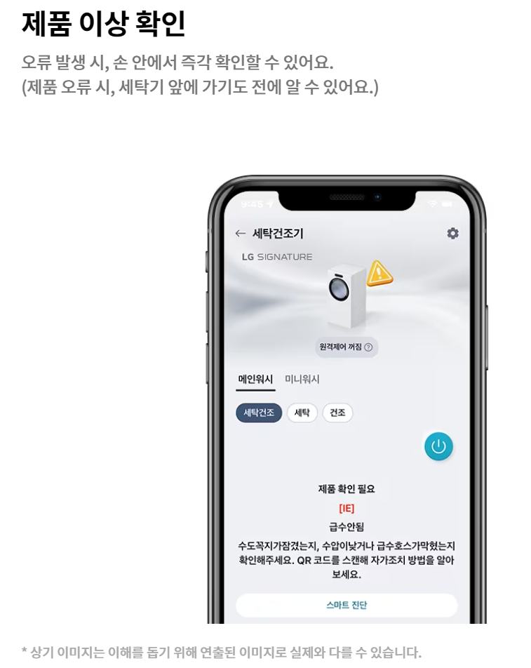 *LG ThinQ App를 통한 원격제어 기능으로 세탁실 밖에서 세탁 건조까지 가능합니다.